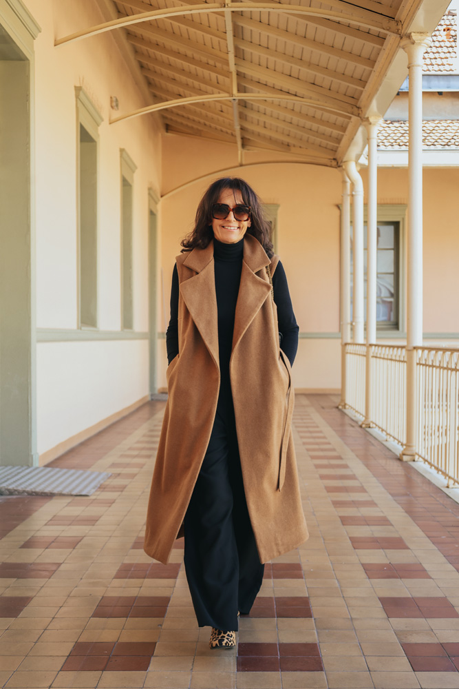 Rachel est un manteau sans manches ceinturé qui peut être porté tout au long de l’année.